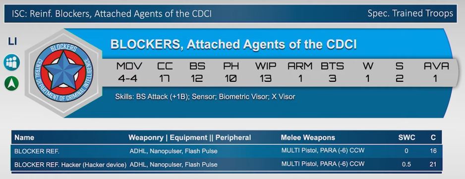 Genghis Cohen: An unusual utility support unit. Sensor is definitely their biggest skill, a great tool to have arrive into the midfield. BS Attack (+1B) and X-Visor would really elevate common weapons, but the Blockers have saved some points costs by only having non-lethal options beyond 8" effectiveness. A multi-pistol+1B is nice, but even with an X-Visor it's not really good beyond 8". Their weapons do make them well suited to outshooting or trading with Camouflage models they've flushed out with Sensor however. Biometric Visor is situational at the best of times and nigh useless on a Reinforcement - most Impersonators will have their plays resolved one way or another in Round 1, before they arrive.Outside of Reinforcements, this unit is unlikely to see much play in vanilla PanO, except for those who really want to shoehorn Sensor into their lists. Its usefulness in Neoterra will be directly tied to its Fireteam options, as it's a cool utility piece to fold into an aggressive Fireteam without breaking the bank.