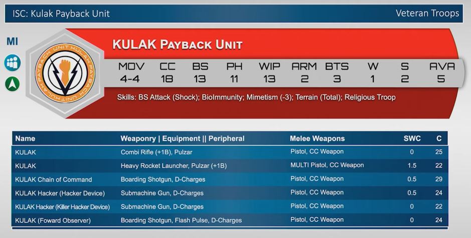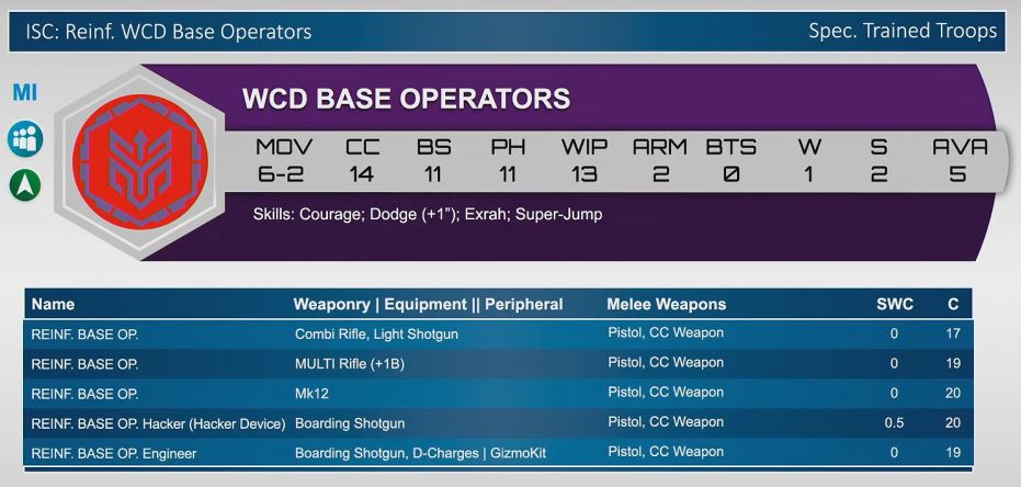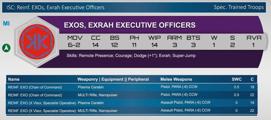 Musterkrux: Having Chain of Command is a bit of a slap to the face, seeing as you check for LoL before your Reinforcements arrive* but at least they've costed it appropriately (note how the CoC profile costs as much as their Specialist Operative, which is usually +1 point). That said, honestly these are great profiles. Super-Jump on a 6-2 chassis with a BS 12 Plasma Carbine/Multi Rifle is very nice for the price you're paying for it. We'll have to see the full Exrah rule before I'm willing to comment on its interactions with Remote Presence, though.Genghis Cohen: Yeah, CoC gives them a clear niche, although as you note it doesn't play super well with Reinforcements, and if you're using your Reinforcements aggressively it may not matter the next Turn either! I'm more of a fan of their weapons than the Base Operators', and at least they're BS12, but I primarily see these as mission specialists.