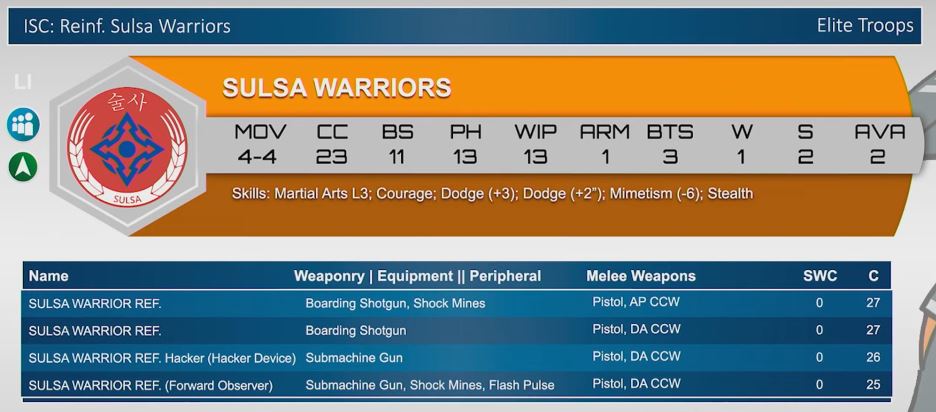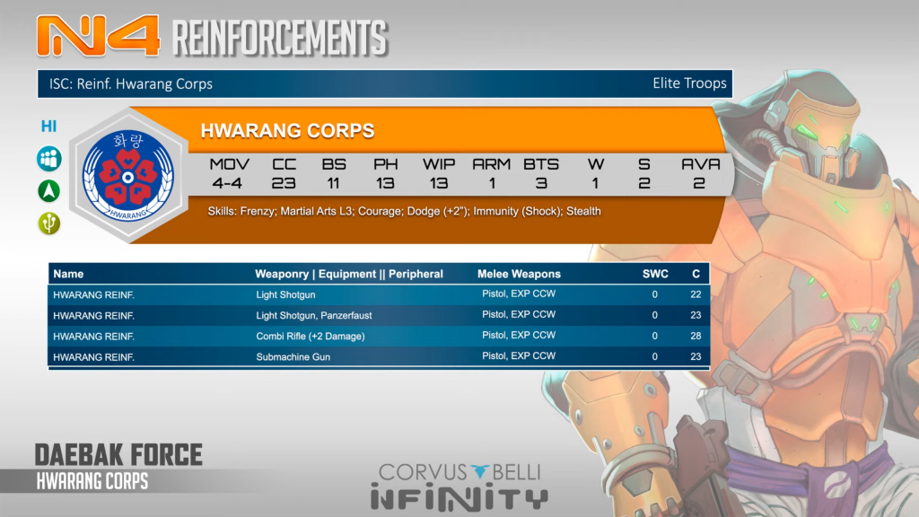 Attention: the statline there is acknowledged by CB as a mistake, in fact Hwarang are: Mov 6-2, CC22, BS12, PH13, WIP13, ARM3, BTS3, W2, S2, AVA4.Genghis Cohen: Note the errors in the picture above, seemingly caused by a copy/paste error. In fact Hwarang are very solid cheap HI with a Close Combat focus (CC 22, Martial Arts 3 and EXP CCWs). This sort of cheap melee-focussed HI is a design space CB has been exploring recently. Take HI, push their stats down a bit in some areas, give them a super-cheap primary ranged weapon and maybe a disposable long-range weapon, pump up the melee skills. Boom, cheap 2W models, which can be super useful as road blocks or as assault troops. These guys are not quite as optimised as Teutons, Tankos or Cenobites - but none of those guys can start in a Fireteam on the halfway line! A really useful addition to Reinforcements, especially as filler in a team with better gunfighters.