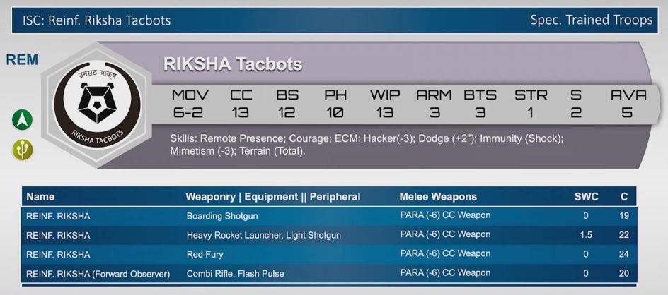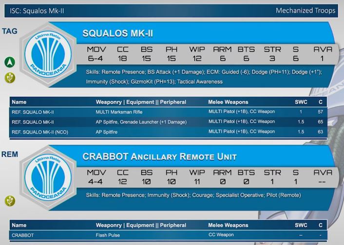 Genghis Cohen: Only 2 profiles here - as 1W models with Mimetism-3 and BS Attack (Shock), you'd expect these to be gunfighters. In fact they get a plain boarding shotgun profile, which isn't very interesting - template range being a very difficult space for such units to exist in - and a nifty SMG-toting Engineer with Tactical Awareness. This is a terrific profile for PanO, a faction with Remote Awareness TAGs, to have as support. The only downside is although they can form a Duo, you can't realistically fit it alongside the Squalo Mk2 in the actual Reinforcements group due to points cost. It doesn't appear you could even fit in a 3rd model alongside them, so for Orders you'd be leaning heavily on their ability to feed 2 TacAware and 1 NCO Orders into the Duo.However a Reinf Blade-Ops could also be top notch support for a TAG in your main combat group, and it will likely reach Neoterra, and possibly vanilla PanO, with a non-Reinf profile. That would be terrific, especially if it retains any useful Fireteam options (esp Duo-ing with TAGs) in either. Watch this space.