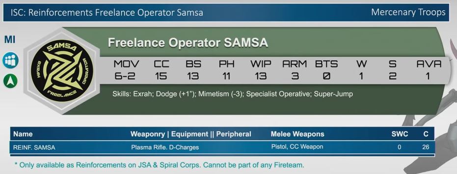 So, the closest thing we got to a 'new unit' for NA2 was the Freelance Operator - Samsa. Well, they're certainly a guy. A bug-guy. They're actually a pretty good profile (but you'd want to be for 30 points), so I'm moderately pleased with this profile. We await confirmation as to whether the Samsa is allowed in every NA2 sectorial as Reinforcements or only JSA/Ikari.Genghis Cohen: Yeah, I think a BS13 Mimetism Plasma Rifle in the midfield is a pretty swell addition to most NA2 factions.