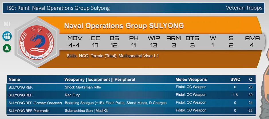 Genghis Cohen: These are classic Medium Infantry. MSV1 NCOs with some light shooting (shock marksman rifle or red fury) and some utility specialists with shorter ranged Weapons. Personally, I am not a fan. They're cool and usable, but fall into what some call a trap zone of points costs. 23-30pts is not enough to get a punchy attack piece, but too much to be disposable for trades, or a cheap Fireteam filler. They're just not a key unit type you want. Everyone needs gunfighters, but a shock marksman or red fury at BS12 doesn't cut it, even with MSV1. I'm more positive about the Forward Observer and Paramedic options, especially in Reinforcements where they can start in the midfield. They could have a use hunting Camouflage or Mimetism skirmishers, but mostly I think their value is folded into Fireteams to support other units - NCO is valuable there.Outside of Reinforcements, I think their value will be wholly dictated by Fireteam options.
