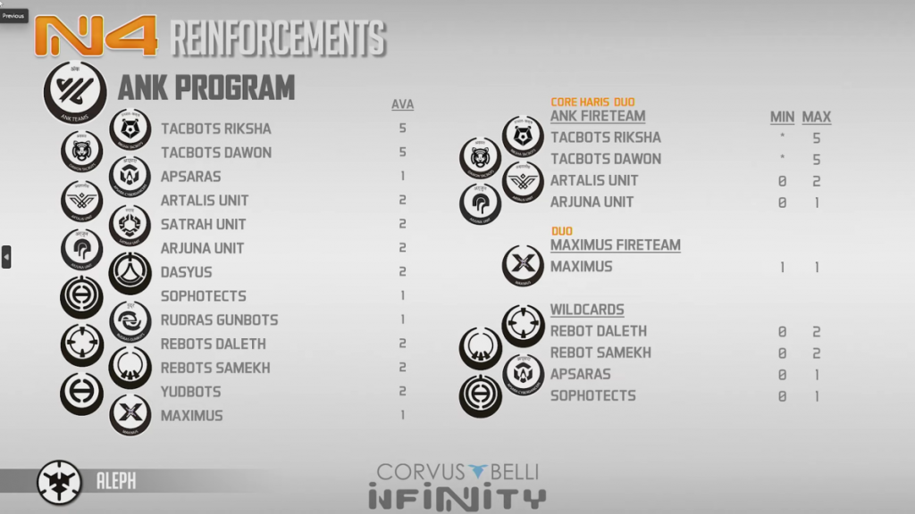 Genghis Cohen: Aleph get Commlink, with no bonus, on Thorikatai and Dakinis. Vanilla Aleph and OSS also get Maximus added to their Main Section roster. A couple unit tweaks:- Arjuna get Tactical Awareness (and AVA2 and a very small cc bump), going up in cost 3 points as a result. I think this makes them much more interesting. Units with peripherals are something of finesse pieces, you really have to practice to get the most out of them in offense or defence, so these still aren't a competitive auto-take we'll see everywhere, but they are potentially very useful pieces.