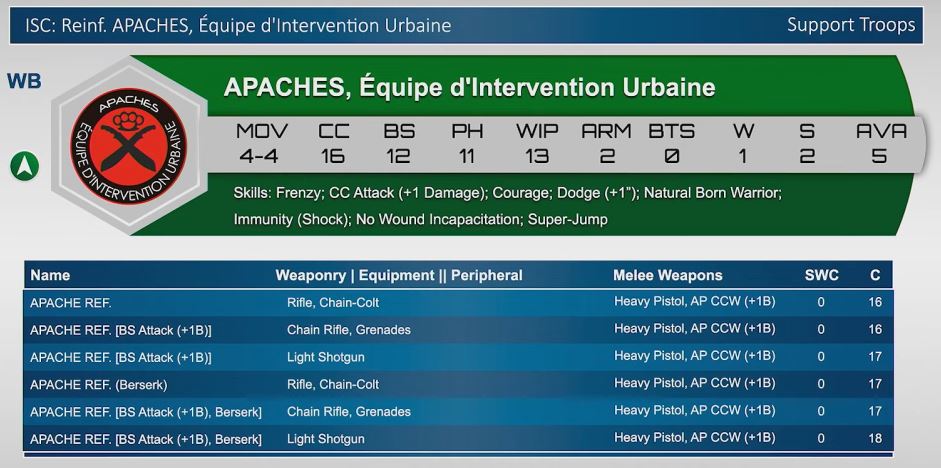 Note another copy/paste error by CB. The correct profile is: Mov6-2, CC22, BS11, PH13, WIP12, ARM1, BTS0, W1, S2, AVA2Musterkrux: Oh wow. I still love Apaches. They don't appear to be in Vanilla Ariadna (which is a mild but understandable shame) but they are AVA 2 Wildcards that count as Loup Garou in FRRM. A 6-2, Super Jump, NWI Warband that can either drop Burst 3 templates or make Burst 2 CC attacks for the bargain price of 17 points is very, very good. Probably not enough to save FRRM as a Sectorial but a lovely quality of life improvement to a 'Playable but out of catalogue' sectorial.