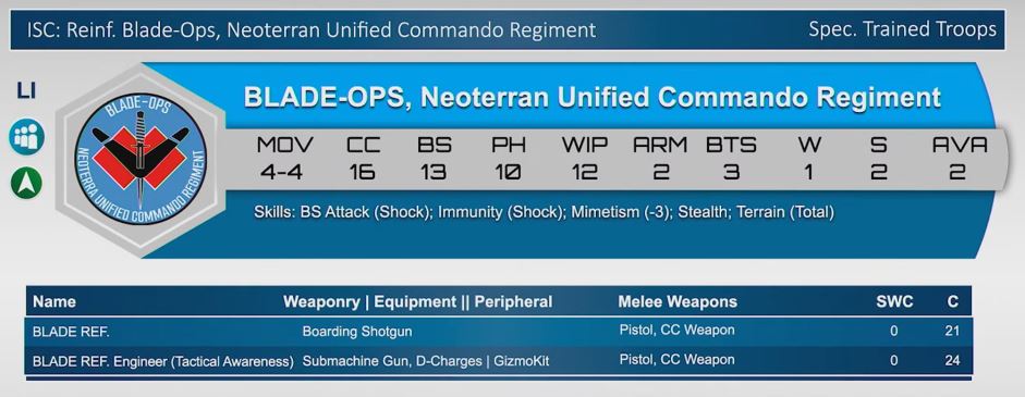 The Blade-Ops TacAware SMG engineer is definitely the standout to me here, in a Duo with the best Squalo Mk2 Reinforcement, an AP spitfire. They are 87pts, so you can't even fit in a third model since Agnes is the cheapest Reinforcement at 14. But this dynamic pairing gives you 2 Regular Orders, 2 TacAware and any NCO, plus you can always swap in your Commlink trooper. I think that's a fairly punchy way to Reinforce and will definitely try it with a Knight Commander +1 Lt Order in MO.