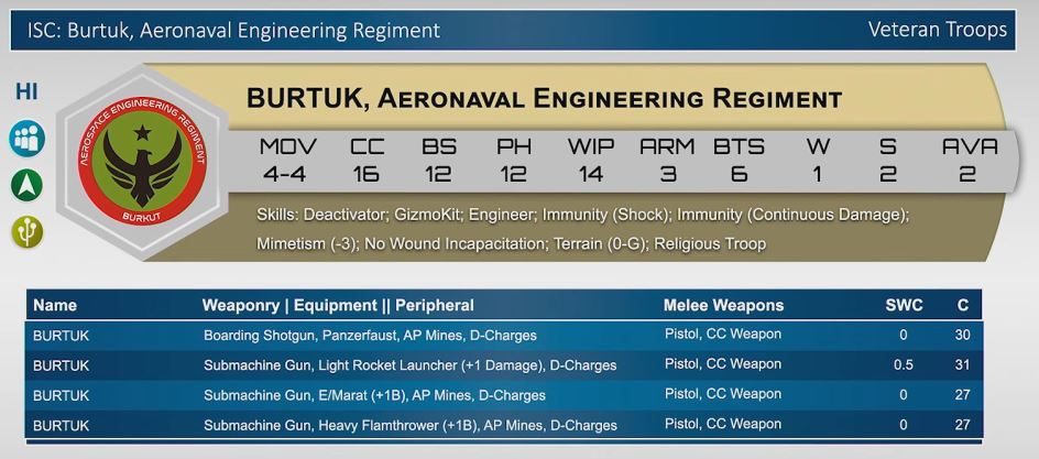 Musterkrux: The platonic ideal of a model in Infinity: Terrain Skill, Shock Immune with No Wound Incap, a visual modifier for F2F rolls, BS 12 with AP-ammo types, costed well with no bloat rules or equipment, and a danged specialist on top of all of that. Burtuks are great. Burtuks are the best single profile released in this rules drop. Fight me.Genghis Cohen: don't forget mines! I am not going to fight you, they're standout great, but they are also fundamentally team players. At 27-31 pts, with limited ability to fight beyond 8", they are absolutely meant to be used as support in Fireteams.