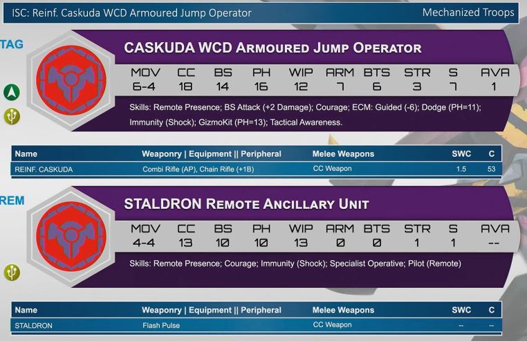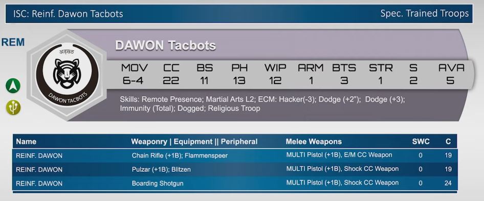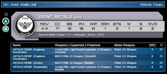 And what absolute units they are. It's mostly simply a straightforward bruiser HI. BS14 and ARM5, with mean SWC guns, at a reasonable price. With TacAware and fully usable in Fireteams no less! Especially as both profiles combine an >16" weapon with an assault pistol, creating an active turn unit that is dangerous at a variety of ranges. While you'd try taking one just for those qualities, it's also got a very interesting Guided ability on the 35pt HRL+1B. Now this won't be the death-dealing machine a conventional Guided missile bot is. It will probably be best used against lighter armoured units. But Guided is a great capability to have. It turns your hackers into existential threats against non-hackable units, so long as you have a couple of Orders. It's also really nice that the B3 weapon has a reason (beyond just cost) to take it over the usual HMG option. This is a unit I really look forward to trying out.Other New Reinforcement Units
