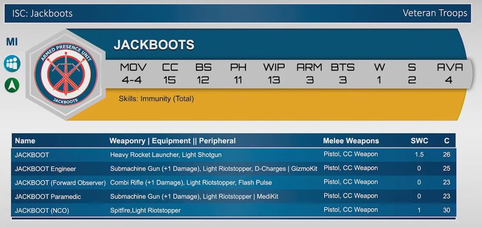 It's sort of telling that Jackboots don't appear in vanilla O-12 or Starmada, because at 23+ points a pop you'd hope for more if you're competing with Kappas for the 'generic infantry slot' in a list. The trend seems to be that CB doesn't want to give factions easy access to sub-20 point models in Reinforcements (I assume they don't want to see more than 4-5 models dropping down), so they've got to buff up Jackboots above that threshold but in doing so I think they're just not going to be competitive in any list that can take LI in the 12-15 point weight-class. Still, for Reinforcements...they're fine, I guess.
