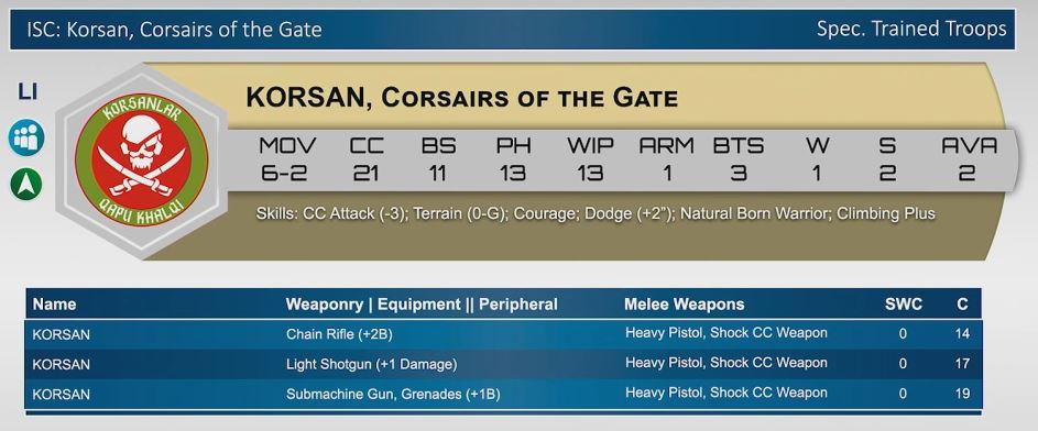 Musterkrux: They're fine. At 14 points for a Regular order in a Reinforcements module I'm fine with Korsan being 'Over-priced Warbands'. Not many other factions are getting their Reinforcement orders this cheap...Genghis Cohen: I quite like them - 6-2 Mov with climbing plus and Dodge+2" gives a melee unit a lot to work with, and +2B chain rifle is exceptional. Weirdly, that profile, the best IMO, is 1pt cheaper as a normal guy than as a Reinforcement. I think that's eminently sensible as the Reinf can start on the halfway line...but the other options are the same cost for both types? No idea.