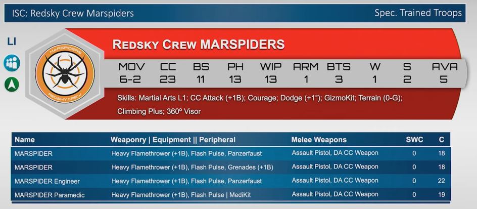 Marspider leads a 5-model Fireteam with 6 orders to play with, a couple of decent guns, everyone is a specialist, the ability to spread out some repeater coverage and Raoul can toss out some Drop Bears to help gum up the midfield that your opponent is also likely looking to have their reinforcements move through.