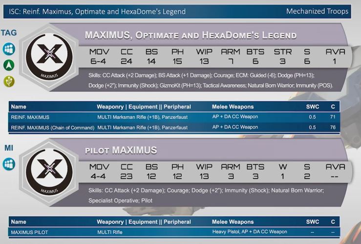 Sorry to be negative, but I don't really like Maximus as a Main Section TAG. He's 71pts for a B4 multi marksman, while Aleph and Steel Phalanx get Agammemnon, who is 62pts (and more SWC, granted) for an AP Spitfire, so functionally very similar with +1Damage, and a B2 heavy flamethrower. He's not quite as good in melee combat, but who cares? Is anyone going to throw a 71-76pt TAG into melee? A TAG just wants to be good enough to bully non-melee combatants or those with shock melee weapons, and to ensure that attacking it with enemy melee units isn't reliable. Yes, Maximus is ARM7 and immune to crits and possession. But he isn't Remote Presence, which is one of the single best rules a TAG can have. Not a fan. I guess it gives OSS a lower priced option than a Marut. But I'd far rather face an opponent using Maximus, than one who'd picked the Marut.In Reinforcements he's a bit better, being the same cost but starting in position to use his loadout. He can be Duo'd with either a cheap bot for TacAware, but even then you're not fitting in a third model in your Reinforcement section. Might as well Duo him with an Engineer-not-Doctor Sophotect, which costs 28pts and I'd bet was created specifically to allow this pairing under the Reinforcement cap. That's at least a usable, if not inspiring, Reinforcement Section - it's tough to assault directly and your Main Section still has a 13-trooper cap to play with.