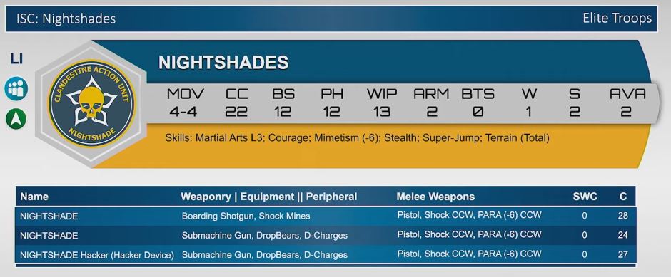 Musterkrux: It was around about the time that I read the Nightshades profile that I decided that maybe, just maybe CB was pushing hard on Mimetism-6 single wound models and, in turn, that having mines and models with DTWs in the mid-field is an excellent way of convincing people to not take Mimetism-6 single wound models in their Reinforcements rosters. Nightshades hate Claymore Mines: Front Toward Enemy.Genghis Cohen: yeah, no Camouflage, no weapons good over 8" and no non-hackable Specialists make this one a pass for me.