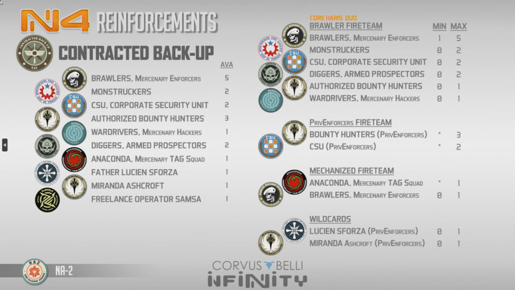 Musterkrux: I've spent some time in the Dojo with respect to NA2 and I maintain my position that I'm not a huge fan of what NA2 gets to drop onto the table. I don't hate the reinforcement options but I think the real killer is the tax of having to take a Wardriver (who takes up a Combat slot, SWC and has limited integration with Fireteams) who only brings Commlink +0, unlike most factions who get +1 at least.