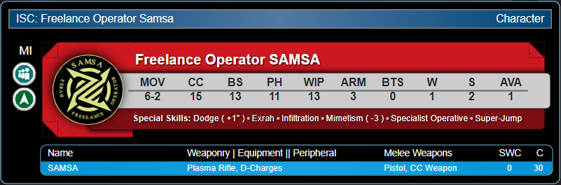 Freelance Operator Samsa (Main Section version) - available to all vanilla Factions bar CAThe new rogue Exrah merc, Freelance Operator Samsa, is available to all vanilla Factions except Combined Army in their Main Sections (he's a Reinforcement choice for NA2 armies). He's not bad - at 30pts for a 1W model with Infiltration and Mimetism-3, but no marker state, the problem will be his fragility, especially if playing second you may struggle to keep him alive. But if you can, or are playing first and happy to use him as a disposable attack piece, he's a BS13 plasma rifle that starts in the midfield, is a Spec Op for doing missions, and is highly mobile with 6-2MOV and Super-Jump. Far from an auto-take in most factions, but certainly very usable.