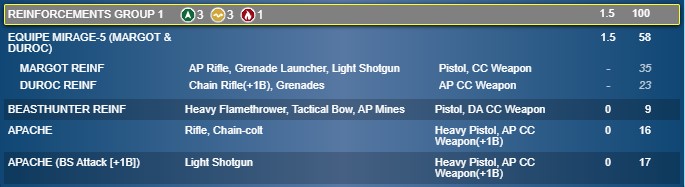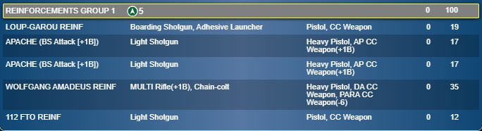 Take a Loup Garou BSG, 2x Apaches, an FTO 112 Medic and then slap in Wolfgang Amadeus to end up with a 5-person Fireteam (if you're playing in a Sectorial, at least) packing a BS 13, Burst 5 Multi-Rifle and 5 orders to push it around the table. I didn't think we'd see many viable Fireteam Core options in Reinforcements but...Surprise! So close to it being a pure Fireteam, as well...Genghis Cohen: Wolfgang is a great pick and actually Bruant has a T2 rifle and X Visor profile that makes a decent Fireteam leader (I'm not even sure if he's changed from before, MRRF are that uncommon). But I do think Equipe Mirage 5 and Apaches are the real aggression in the roster. There are some decent 1W 'light gunfighter' types, Moblots, Para-Commandos and Briscards are all usable, and while not super scary on their own, we will probably need them to cover the melee combatants.