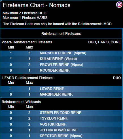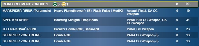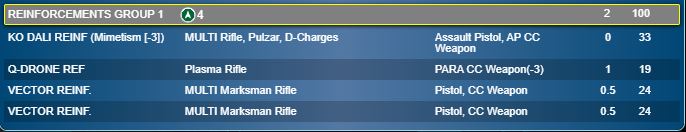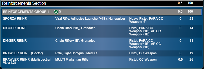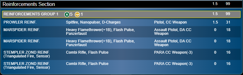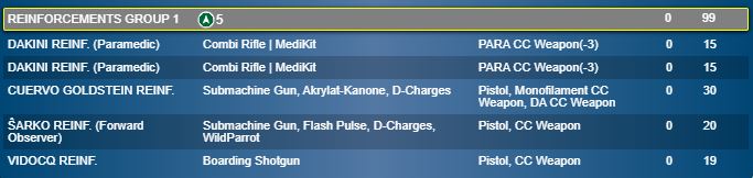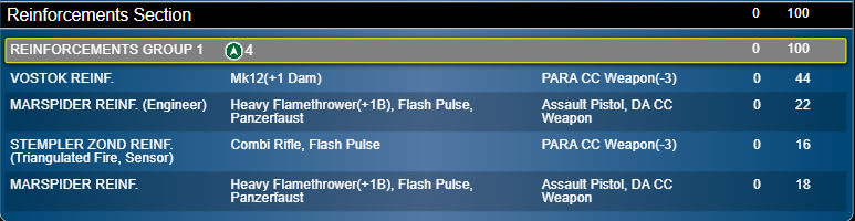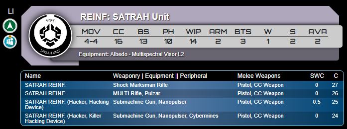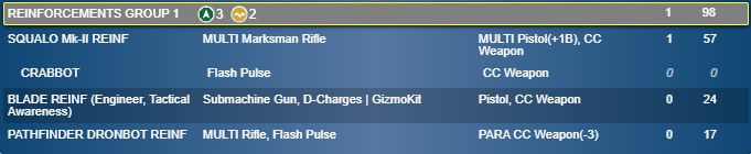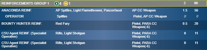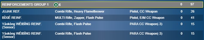 Reinforcements is an alternate game mode - so you would agree on its use before playing a game with a friend, and of course it would be advertised as part of a tournament. The standard size is advised to be 350pts/7SWC. This means each player writes a list of 250pts/5SWC as their 'Main Section' and a separate Combat Group of 100pts/2SWC which is the 'Reinforcements Section'. The latter is drawn from its own roster (a vanilla Faction and all its Sectorials share the same Reinforcements roster) of unique profiles - while many are the same models as the Main Section can take, these are all 'Reinf.' units, so for example the Nomads' Stempler Zond has different profiles to the Reinf. Stempler Zond. Both Sections must keep to the limit of having no more than 15 troopers in total. There's no limit on the number of Combat Groups, or number of models, in each Section (in practice, there's no reason to ever spread 100pts of Reinforcements over more than one group, and your Main Section will be 1-2 Combat Groups). Interestingly, the contents of your Reinforcements Section are open information once the game has begun - no ability to surprise your opponent with what you picked.Commlink