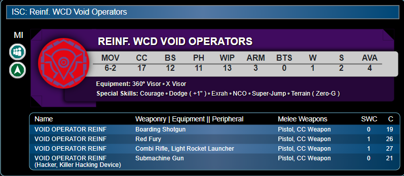 Void Operators are pretty characteristic Exrah profiles, 6-2MOV and Super-Jump, with their special rules being 360 and X Visors, and NCO. Frankly, they have a killer hacker profile, but they are WIP13 BTS0, and two SWC profiles that are ridiculously outclassed by the Vector. If your opponent takes a 25pt/1SWC Void Operator with Red Fury over a 25pt/1.5SWC Vector Operator with spitfire, take them aside and ask them if everything's ok at home - that is not the act of a rational mind. However, you need a Void Operator to compose a Fireteam with a Vector in it. So a lot of people will take the 19pt shotgun profile, and NCO may actually come in handy then for moving the team. Definitely a supporting player in the cast.