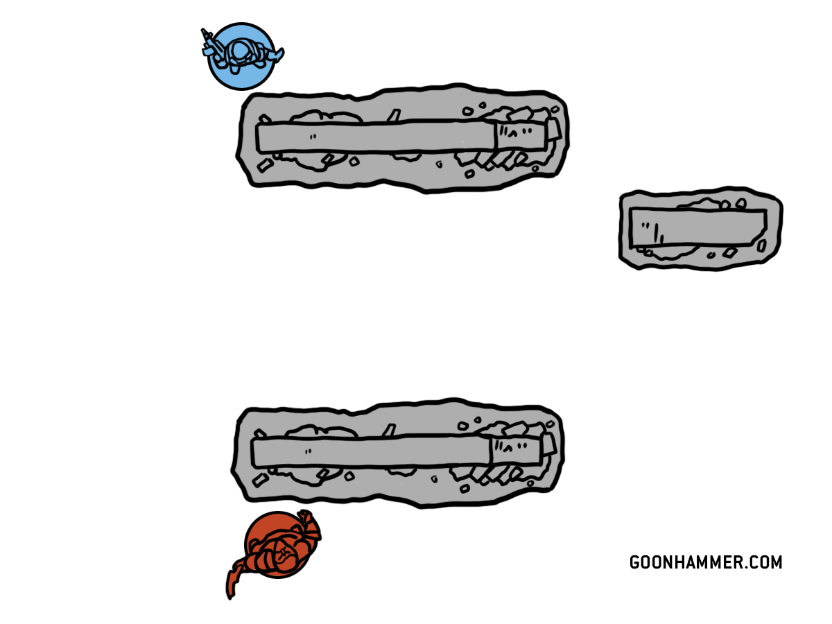 Dali the Daturazi owes Yelvii a beer and sees an opportunity to get out of having to pay it back to him. When Fusilier Claire rounds this corner, he tosses a smoke grenade to cover Yelvii and not himself. This means that if Fusilier Claire kills him and engages Yelvii later in the turn, Claire will be taking the -6 penalty for shooting through smoke.
