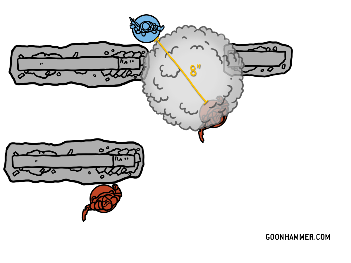 Dalii wants to stab Fusilier Hugo with his sword but just isn't quite close enough. He throws a smoke grenade over the top of the wall to try to get this entire situation resolved in a single order, accepting a -6 penalty to his throw which brings his 17 down to 11.