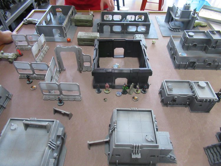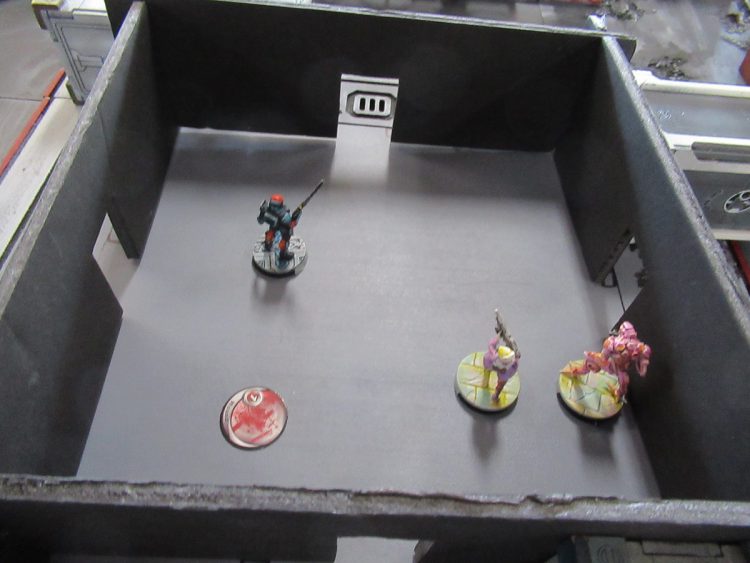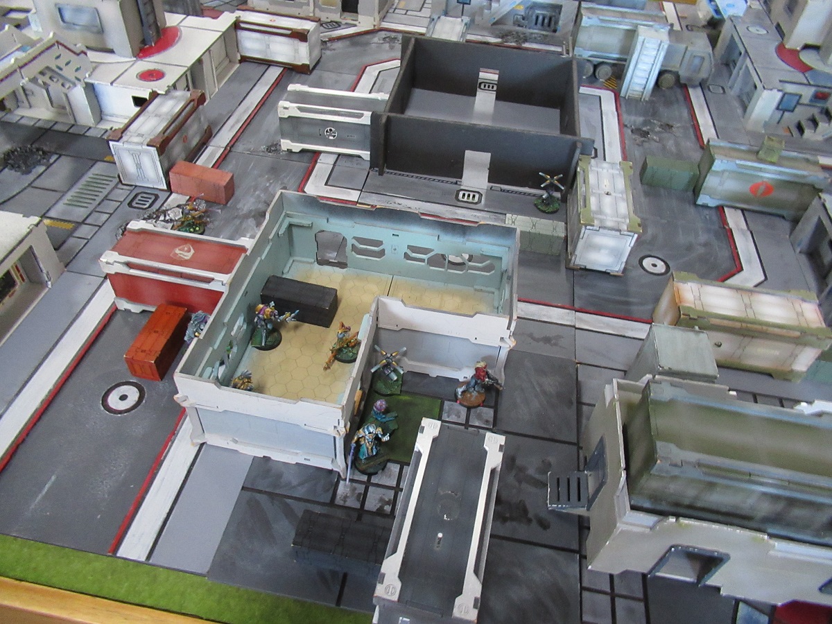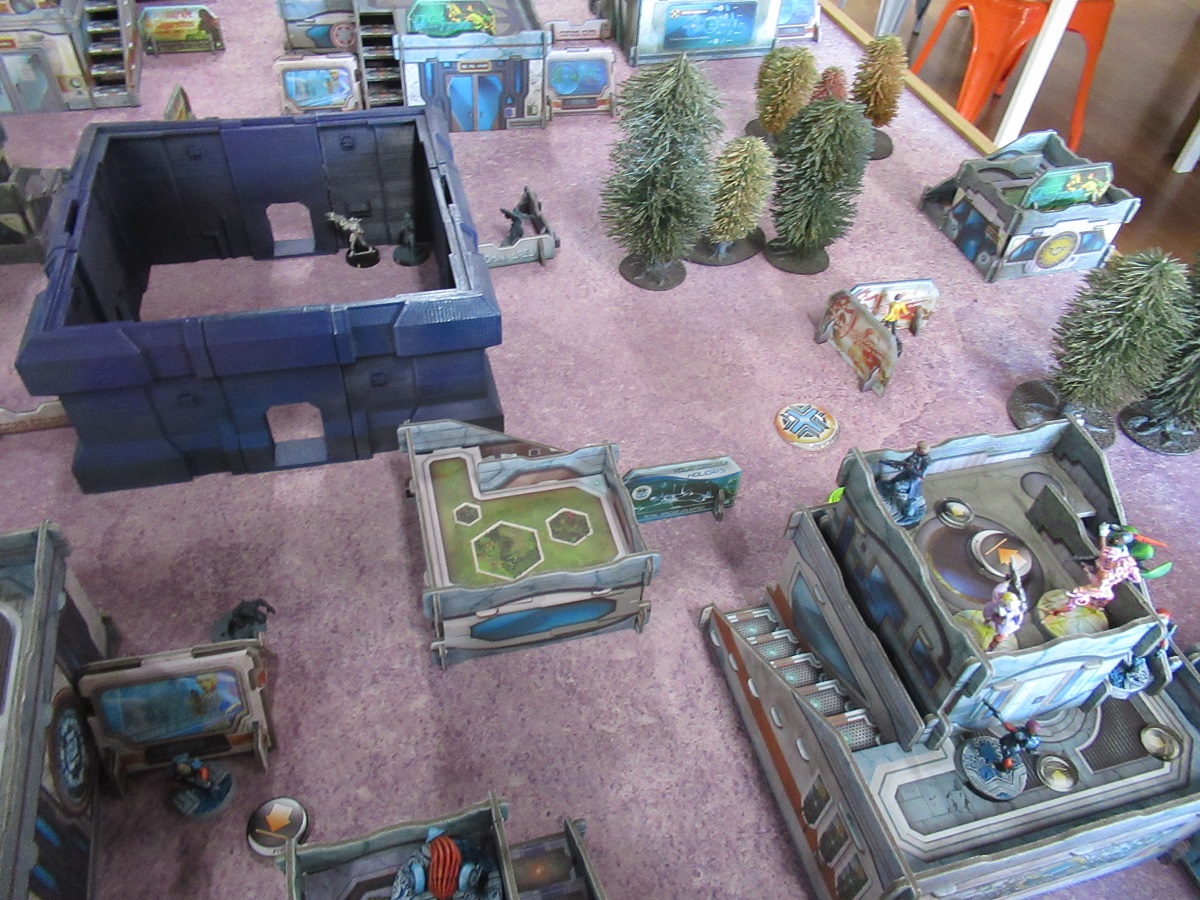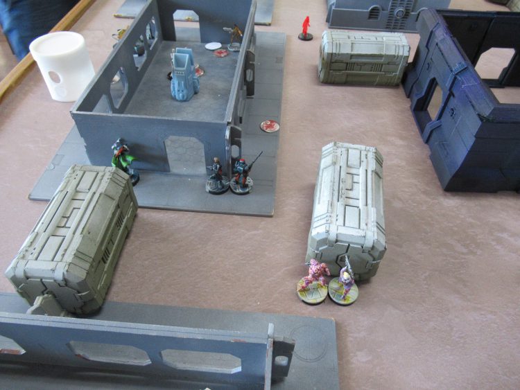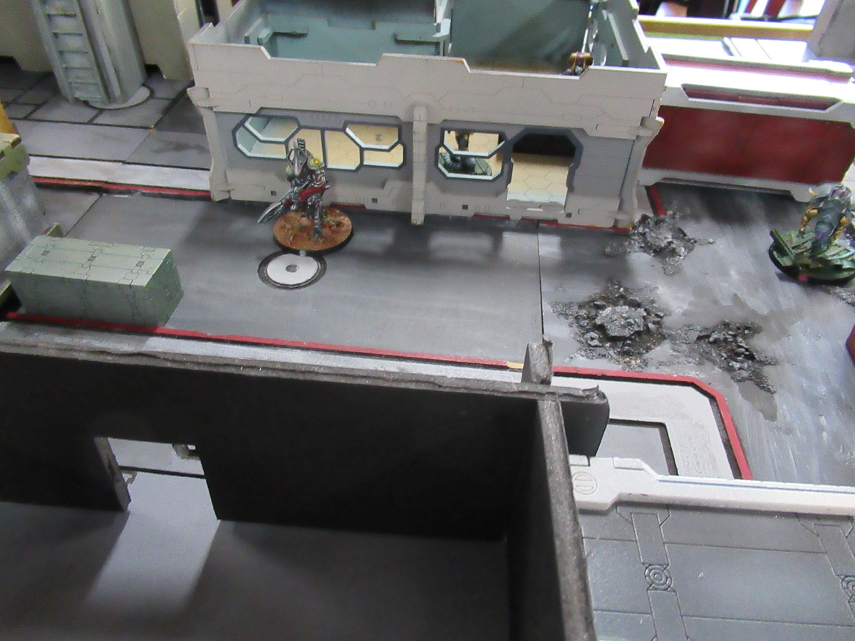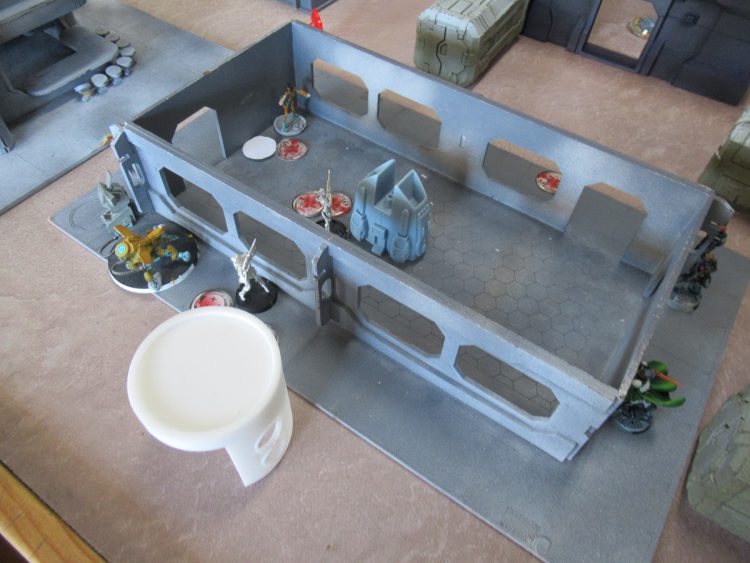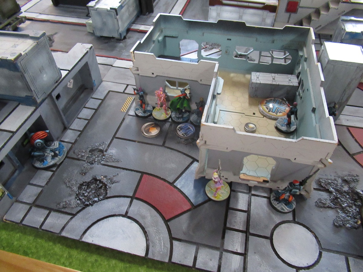 He spends his first turn on a dedicated attack with Sheshkiin - killing my Varangian and two of my Bluecoats. However, in her retreat she got critical hit four times by the total reaction HMG remote over three orders and died. That felt like an extremely serious swing in my favour so when my turn started I immediately decamped my link and ran into the open, intending to secure the objective room. Then I heard the worst thing someone moving a superheavy link out of a confined area can hear: