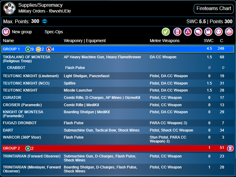 Well, it finished 10-1 to me, with 198 VP remaining to my opponent's maybe 30 or 40. I think this was a game where I made big mistakes, but perhaps fewer or just less unluckily than my opponent. My opening plan, Tik kamikaze, was broadly viable, and maybe unlucky not to achieve more, but it was incredibly stupid of me not to hold one of my Command Tokens back. If my opponent had not made some errors in his hacking counter I would have given him a game winning advantage. As it was he took more significant casualties in his own Turn 1. I would note that even if I'd had a Command Token, he could have dealt with the Tik via smoke and a Morlock as well. The other big points where simple errors decided the game were the Montesa attack run, when we missed a very good chance for Zoe and Billie to stop my rampage, and the simple fact that it should have ended in Round 2 with a low scoring win for me.Game 2: Supremacy
