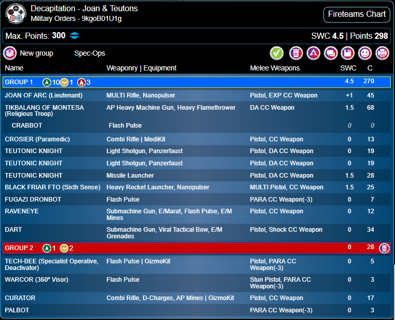 I have little experience with Joan, I don’t love the background idea and she’s a meaty Lt who is extremely tough but only effective within 16”, or 24” if you take the lighter armored and more expensive mobility version, which I think is less popular these days. That makes her vulnerable to counter-attack. I see her as a classic Round 3 fight piece, and I’d rather take a cheap, secure Teuton or perhaps a Knight Commander if I wanted to maximize NCO Orders. I think she’s still most commonly seen in Hospitaller pain trains, but that’s even less my style. I dislike ‘death star’ units in any game system, they reduce your options to play the game in interesting ways by concentrating your force into one place and one function. But ultimately she’s the toughest Lt you can take in the Sectorial, and once the Lt identity is Open Information, as in Decapitation, that makes her the most secure. You can also make her your reserve deployment piece to avoid alpha strikes if going second, which is tricky with a Lt who slots into a Fireteam. So I thought this would be a good time to try her out. Of course she is accompanied by her faithful Warcor and Tech-Bee for cheap Regular Orders. Since I was still including the Tikbalang, I naturally supported it with a Curator, and included my usual Teuton/Crosier Fireteam. This time I went with a Black Friar HRL alongside my Teuton ML, partly to defend against smoke-rushing warbands and partly because the Teuton spitfire is much less attractive when you have an alternative use for the Lt Order. Finally I took Dart as in the other list - if a Tikbalang couldn’t get to a Lt or Designated Target, hopefully she could.