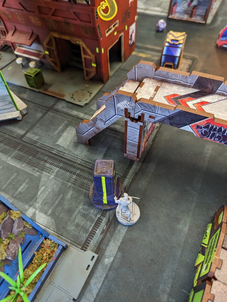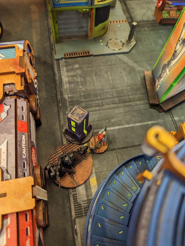 I used 1 Order move-moving, then I was into the CA backline. The MBH gunned down his SMG-wielding opposite number from outside ARO template range. Before unleashing the Su Jian, I then split the MBH off with its own Irregular Order, splitting my Burst wildly between 2 Imetrons, a Taigha and either his Dodging Legate or missile bot, I forget which. This failed to accomplish anything, but I tried again and this time put down a Taigha, the missile bot and an Imetron, while tanking successive chaincolt templates from the Taigha and miraculously surviving. Not even using that +4ARM from Booty, I just rolled hot. The Su Jian then moved into the gap, getting within 8” of the Legate (its prone position on a ledge couldn’t save it from the climbing plus Su Jian crawling over some similarly high crates) and murdering it with the heavy shotgun. Finally, it finished off the other Imetron and came to rest.