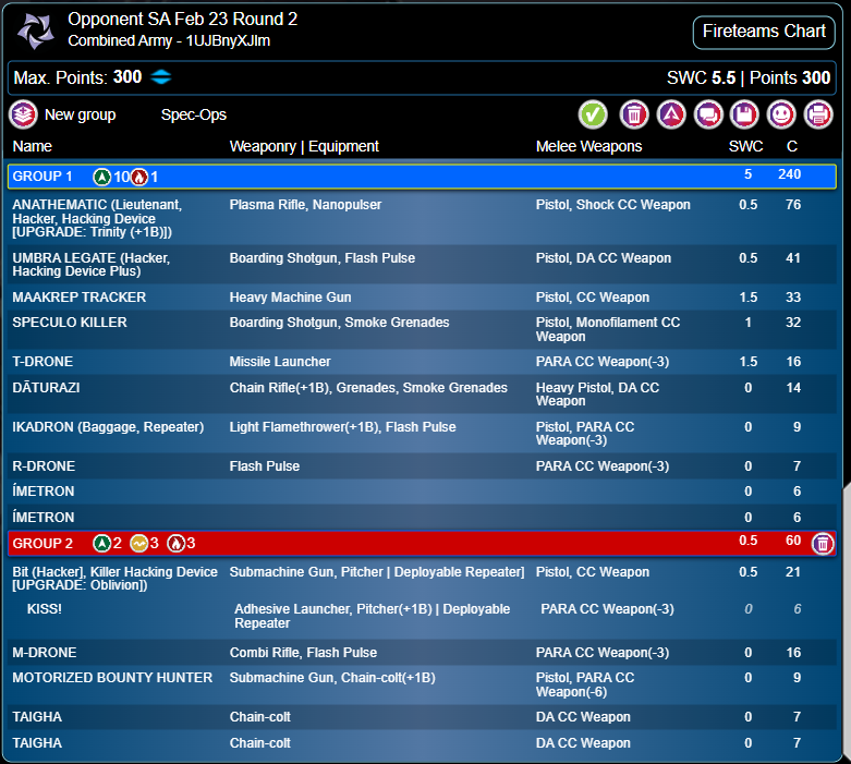 I was happy with the structure of this list because it enables wild offense. The Hsien can clear hard stop AROs, or I can send in the Ninja / trade the SMG Motorised Bounty Hunter to remove something (although I would struggle to do all three of these at once, due to Orders). That leaves the entirety of Group 1 Order pool to push the Su Jian Duo. It was interesting to see how that theory panned out. I could experiment with removing the Crane, who is more redundancy than my first choice of attack vector, and the SMG bike, and that would let me include a Pheasant for Chain of Command, Tao Wu for Counterintelligence, and upgrade my Ninja to a regular Hacker with a much more useful SMG. That would further enable the Su Jian push, and deal with my vulnerability to Loss of Lieutenant. But arguably that's a lot of direct power to give up, for contingency planning.