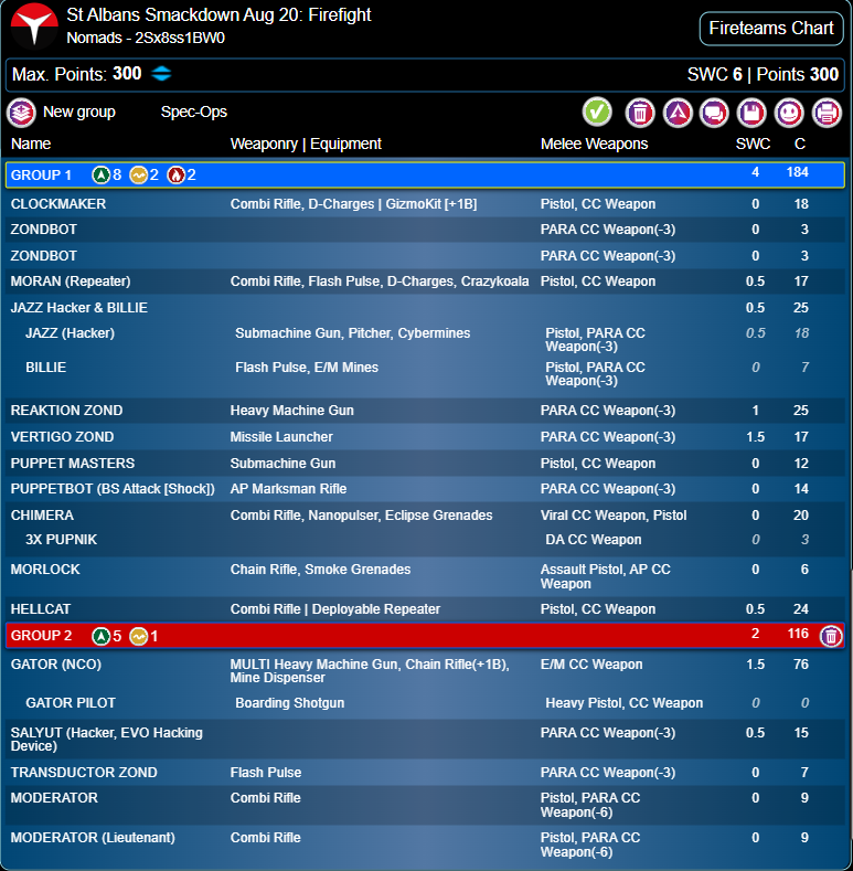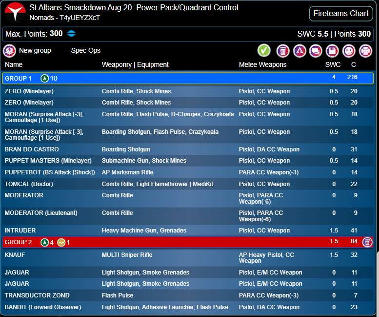 My initial mission analysis made me want to write one list for Power Pack/Quadrant Control, where I prefer going second and where Infiltration and other Forward Deployment is extremely beneficial, and one for Firefight, where I love going first, forward Specialists are a liability, and and 16” deployment zones give a relative boost to warbands and other non-infiltrating pieces. I have been doing my lists this way - decide on a mission split and pre-pick which list to use for every mission - for a long time. But recently I have heard some competing views which are quite compelling. It can be very useful to keep the option to pick a list for terrain or the opposing faction. So I also wanted to take two quite different lists, so that I could switch my mission-oriented original decision if I felt it necessary.My only painted army is Nomads/Corregidor, so under those mission parameters, I decided to play vanilla Nomads. I was tempted by Corregidor’s access to McMurrough and warband Haris Fireteam options for Firefight, and by aggressive Fireteams for Quadrant Control, I ultimately thought my best option for going second and still holding far quadrants, or threatening the central line and enemy table half objectives in Power Pack, was massed infiltrating specialists and/or Camouflage. Corregidor can do this, but it’s more versatile and efficient with vanilla Nomads. I also had an alternative plan for Firefight with vanilla Nomads which I thought would be equally effective. Finally, I have recently put together some nice proxies (I don’t like the official sculpts) for Uberfallkommando and Puppetbots. I wanted to use them, both because I like my proxy models and because they’re excellent competitive units.