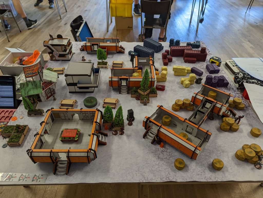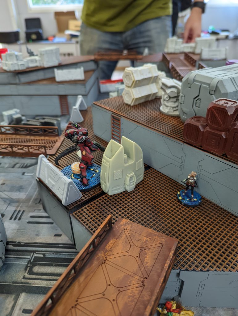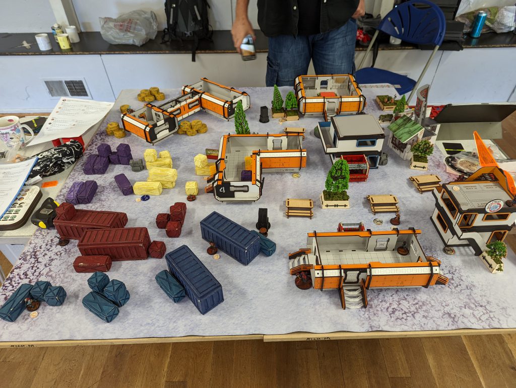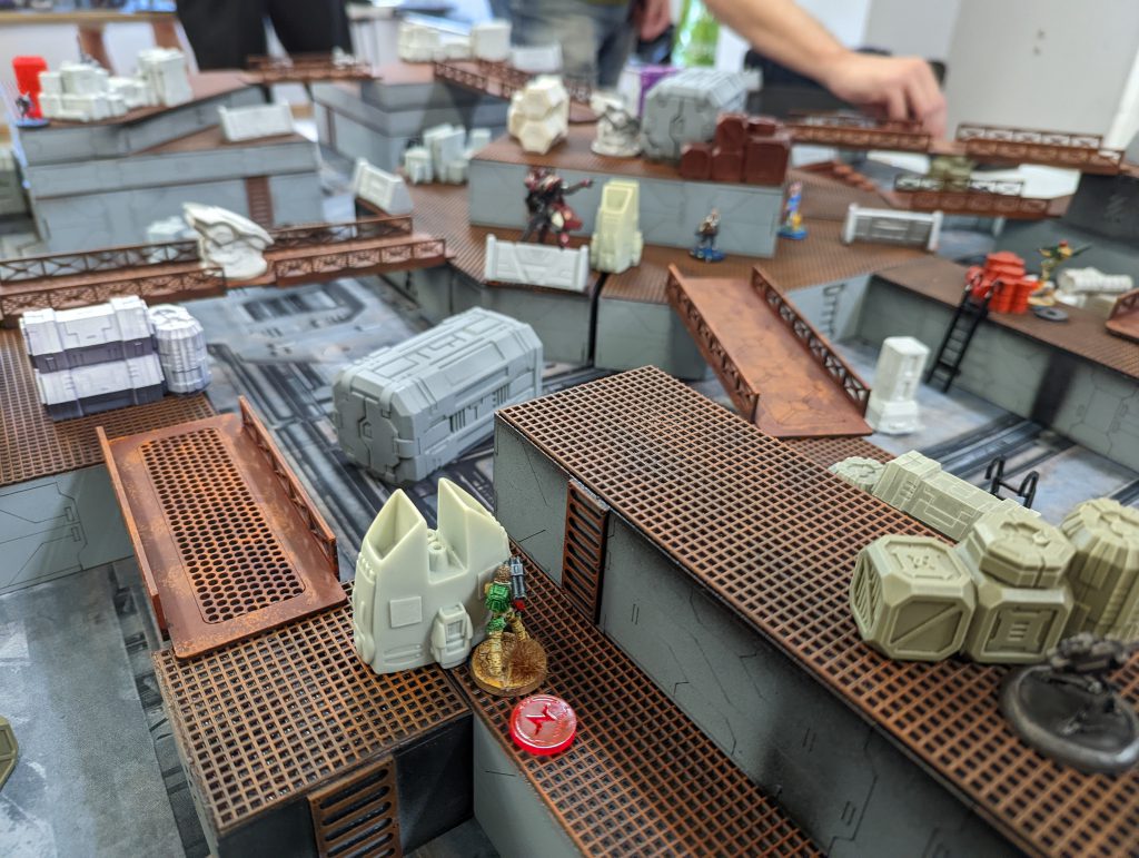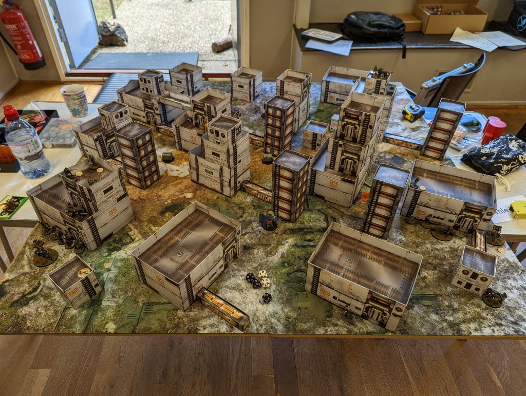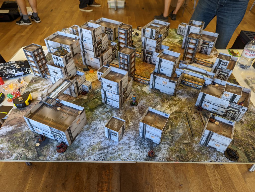 This isn’t strictly relevant to a tournament/battle report, but I wanted to share my work-in-progress Infinity table. The Smackdown venue does host a small gaming club, but it doesn’t have 8 tables’ worth of terrain, it mostly relies on attendees bringing sets along. For the first time I was in a position to do so and it really pleased me to see it in action.
