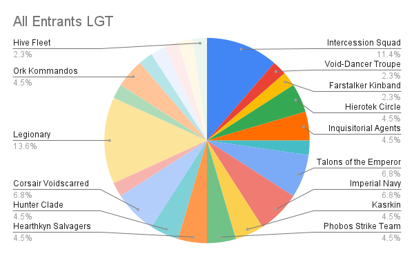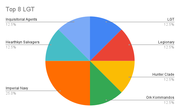 LGT Top 8 Faction BreakdownWhen zooming out to overall attendance for the LGT, we see a broad selection of teams, with the obvious nod towards a larger number of elite-sized teams. Between the two charts it does seem like ITD is a fairly wide pool of teams. Notable misses from the format include Veteran Guard, Pathfinders, and surprisingly, Fellgor Ravagers!