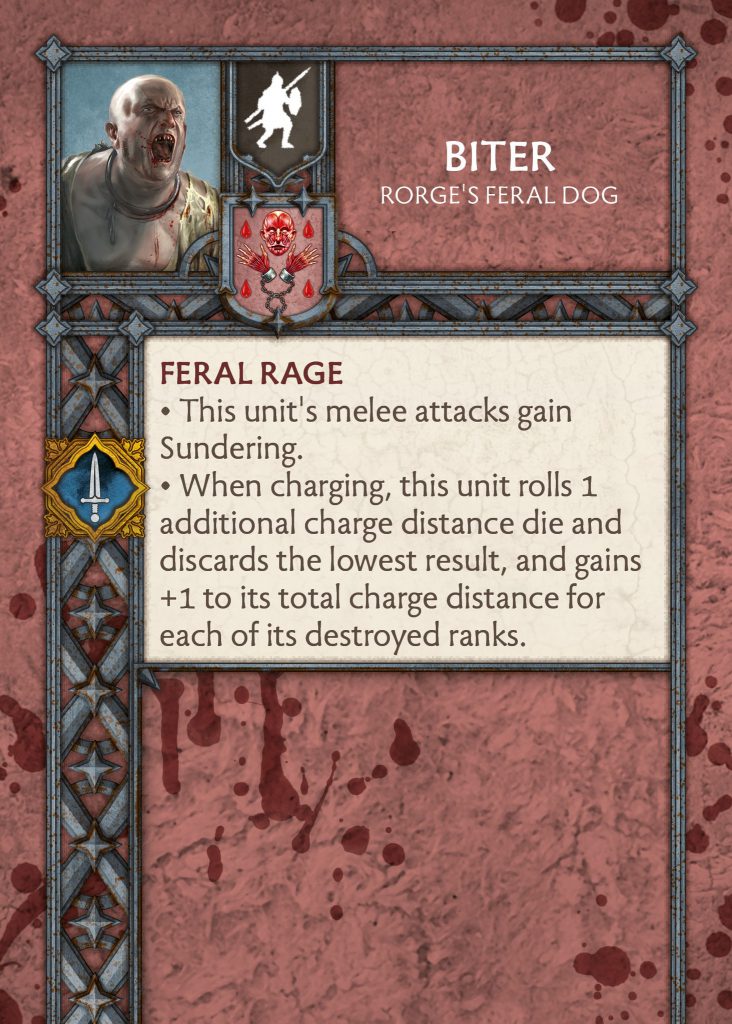 Biter - CMONBiter - Biter brought gang-up before which is actually great ability for the Neutrals but you just didn’t have space for both him and Rorge whilst utilising all your attachment points. His rework is incredible since he gives you +1 to your charge rolls for each destroyed rank (first of its kind in the game), sundering on melee attacks, and you roll two charge dice discarding the lowest. For a 1pts attachment, this is far too much. He will be taken in many lists no doubt and I am eyeing him up for the Bastard’s Girls. Biter may need to be toned down in this instance.