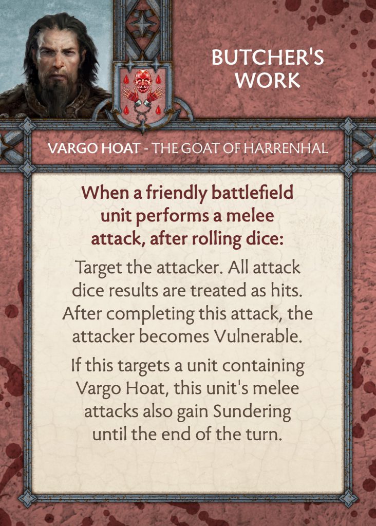 Vargo Hoat Tactics Card - CMONButcher’s Work - A new card for Vargo and works similarly to price of failure in that all your attack dice automatically hit but the attacker then becomes vulnerable. But, if it is also Vargo’s unit then it is counted as having sundering for the attack until the end of the turn. For the first time ever I am saying that this would be great for Dreadfort Spearmen. 4+ to hit sucks, but imagine doing this on set for charge where you also don’t have rerolls? All other Bolton units hit on a 3+ so I am unsure how useful it will be, the sundering is a big deal though.