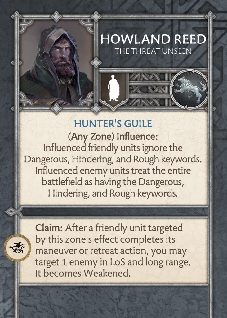 The changes to Howland in the format are substantial. Just like Rodrik he has an influence which triggers off of any zone on the board and is an influence ability for a friendly unit to ignore some keywords of terrain just like the ability pathfinder. In addition, all enemy units treat the entire battlefield as having dangerous, hindering, and rough keywords. This is way too strong! If it is all terrain pieces it would be too strong. If dangerous has not changed this is brutal. Honestly could be one of the best NCUs in the game for this alone.