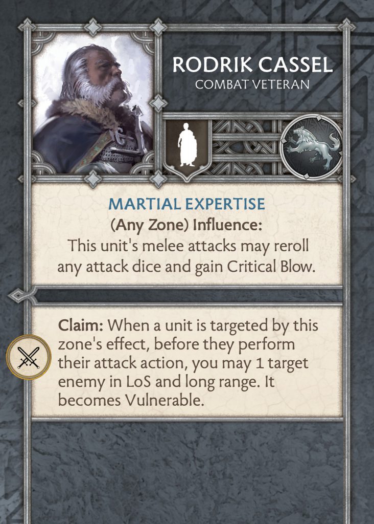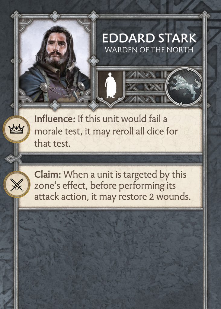 Warden Ned has had a rework but keeps the same theme. Now if he takes the crown zone then he can influence a unit with an ability to always let them reroll morale. If he takes the swords zone, then the unit targeted by the zone heals two wounds before performing the attack action. This feels more like a 4pts NCU to me due to how limited it is if not played early enough. I like that it feels a lot like his current commander attachment with the theme of boosting morale and healing being Ned's identity. I am unsure if this is good enough for him to be taken over the other NCUs as they stand right now, but also from the others shown off. I am interested in seeing the final version as well as his Hand of the King version.