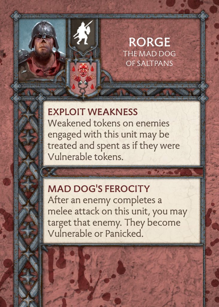 Rorge - CMONRorge - My biggest issues with Rorge and Biter was that it didn’t fit with the list building in the Neutral faction, the same with Widower and Jokin. Thanks to free attachment points and adaptive from Stormcrow Mercenaries, a 0pts attachment didn’t have a place to go. The change has them no longer tied to each other and are now their own entities for you to build your list with. Rorge is completely different, he used to boost your retreats and give out vicious and highest attack dice, both abilities worked well with the Mummers. Now he is a token generator where he can make you vulnerable or panicked on the charge and spend weakened tokens as if they were vulnerable tokens. In comparison to all the other attachments the Boltons have, this will be at the bottom of the list. There are so many other options with better effects to pull from and generating one token on a charge which is not the token you are flexible with is lackluster. Rorge needs some work.