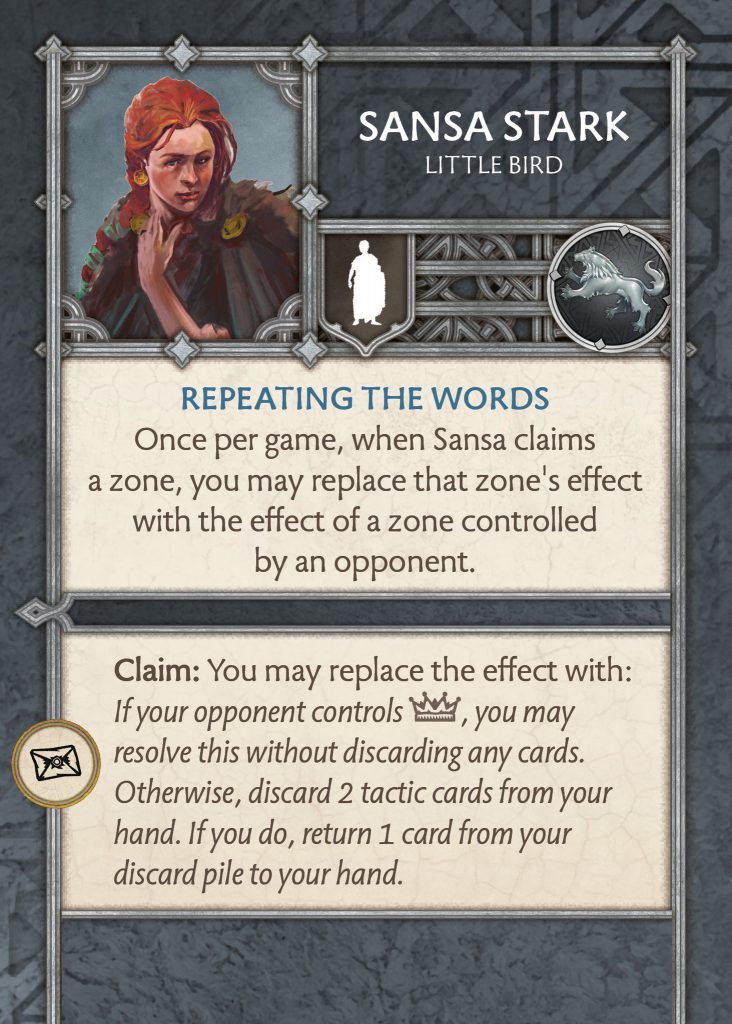 Sansa has gone through a massive change and an overall nerf in my opinion. She has traded her once per game for Petyr Baelish’s once per game of controlling a zone, but this comes with a caveat that it must be one held by your opponent. It is quite flavourful and changes how you may play Sansa in your list. She does keep a way of bringing back a discarded card but it is far more limited. She needs to take the letters zone and discard two tactics cards unless the opponent has the crown zone. This may be too limiting for her to be useful, perhaps only one card would do? However, at the very least I am glad that there are tweaks in the works for her, and hopefully the other two of the trio to freshen up the character options in list building.
