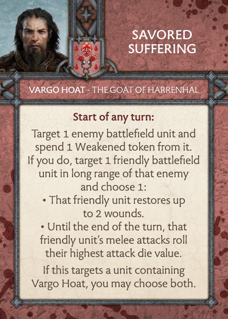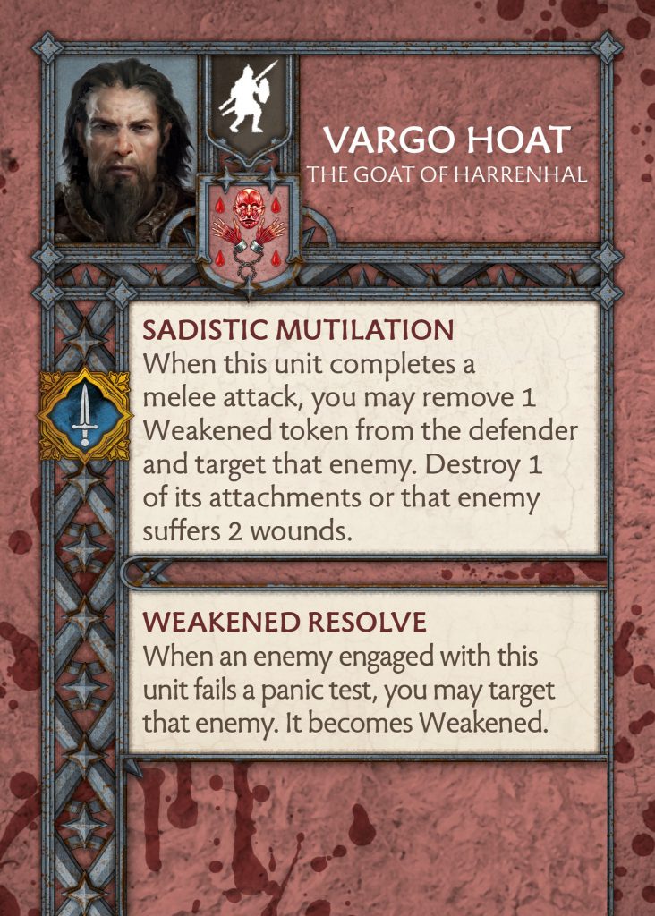 We finally get a look at the new commander for the Bolton faction with Vargo Hoat. We have seen his attachment before which we now learn is the same as the commander version. The card will have a cost you will need to pay if it is being taken as an attachment or free if it is your commander. I think this is for the best as it will allow the game to not be as bloated in the future.Vargo lost Vicious, and both Weakened Resolve and Sadistic Mutilation saw some changes. Weakened Resolve had some wording changes for targeting mechanics. Sadistic Mutilation has the same wording changes to include some targeting clean up, whilst also offering two wounds if you do not want to single out an attachment. This is a change from the previous version we saw which was for unblockable hits, so I am unsure which is right. Changing it from wounds to hits seemed to fix issues with giants and abilities like resilience. I guess only time will tell here.