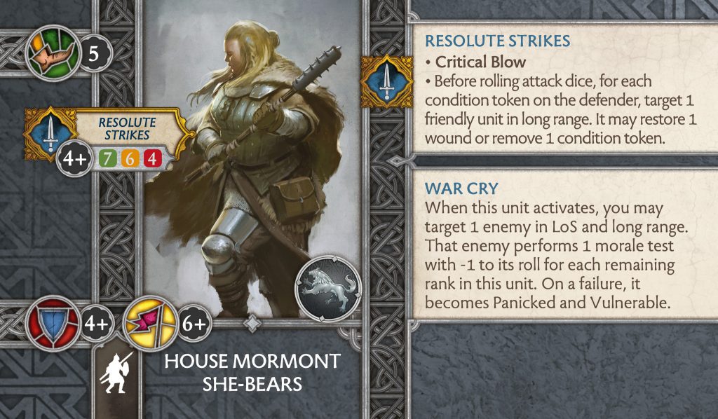 House Mormont She-Bears - CMONShe-Bears - The only change here is to War Cry. There were a lot of comments on the original post with the She-Bears on the changes to War Cry which all suggested it was very bad now. War Cry was a terrible order in comparison to others which auto generate a token, like Threaten and Mark Target. The change from the unit making a morale test to now enemy units making the morale sucked since most morale stats are really good.