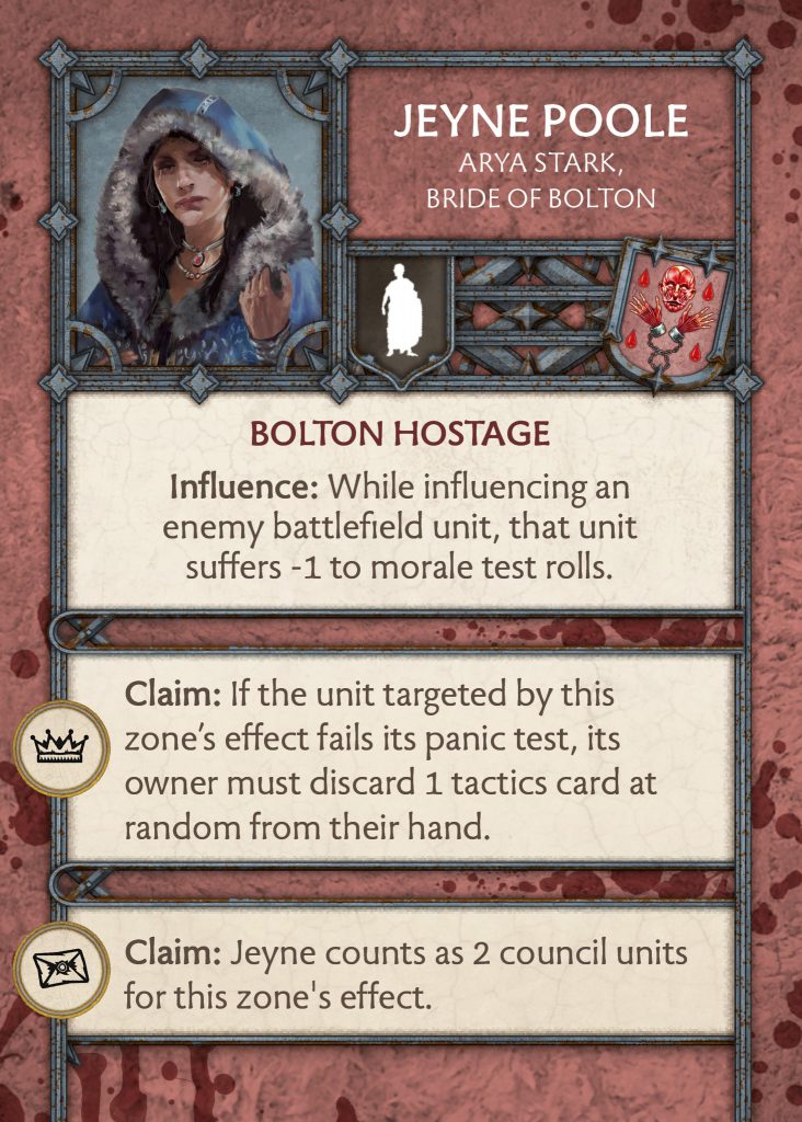 Jeyne lost this ability and the morale influence is now +1, likely to fall in line with minimising changes to morale in the game which has made it less intractable. She did gain an effect for taking the crown and letters zone however. For taking the crown zone, if the unit she targets fails a panic test then the owner of the unit must randomly discard a card. A great ability and I like that there are more effects to failing panic tests for the Boltons than just damage.