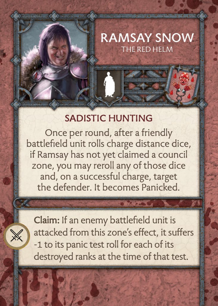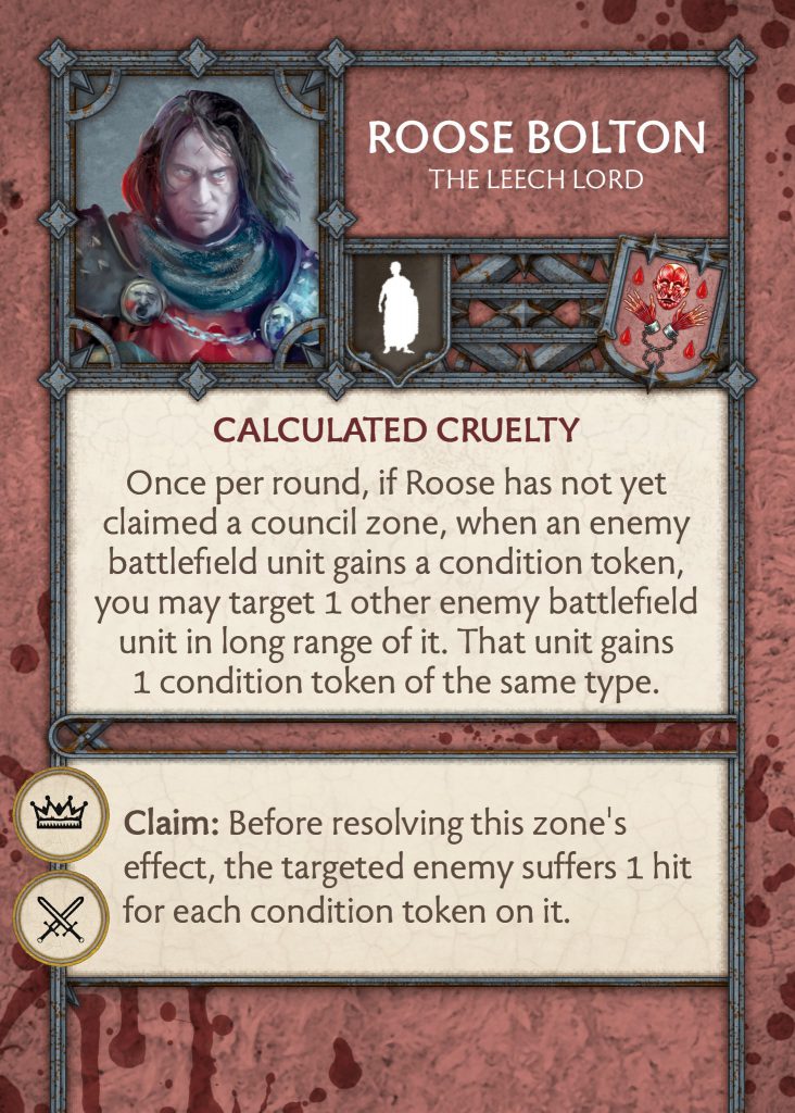 Just like Ramsay, Roose has an effect where if you do not take a zone on the council board then you have access to triggering an effect when an enemy battlefield unit gains a condition token (which will happen a lot since this is the new identity of the faction). You target another enemy unit in long range and give them a token of the same type. In addition to this rule, when Roose claims the crown/sword zone he can make a unit suffer a hit per condition token on them. The current Roose Commander is really good at generating tokens, and I do like that this is Roose’s theme now. His Council unit can further the faction identity whilst also dishing out some hurt where he can. I think it will be quite useful for putting pressure on the opponent making sure they are filled to the brim with condition tokens.