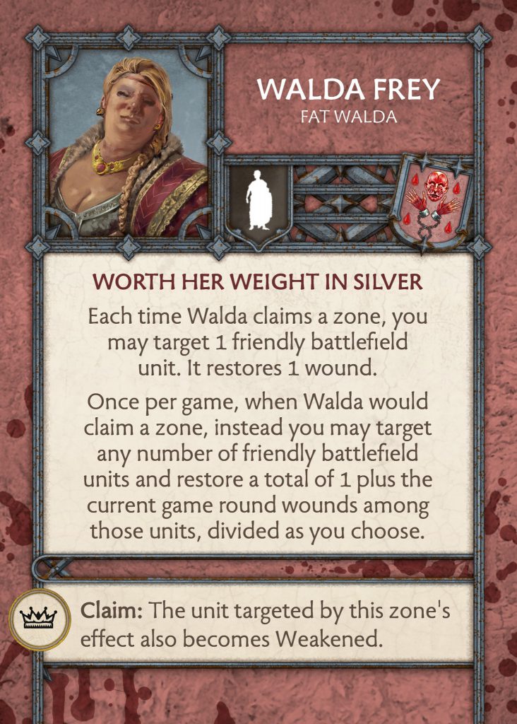 Walda Frey - CMONWalda Frey - Walda is not a great NCU. She gains a benefit depending on which of three zones she takes. Crowns generates a weakened token, letters trade the zone for pulling a commander card from the deck or discard pile, and coins allow you to heal an additional wound instead of removing a token. The effects are okay but nothing ground breaking, the commander can be strong however you are trading a strong effect from the board for mediocre cards, but this would change depending on the strength of the cards the commander brings.