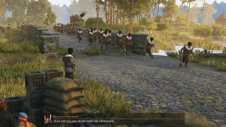 As for the setting, it’s empty-calorie stuff, but that’s perfectly fine for a game that’s mostly here to show off the cool destruction physics and big diesel-engine toys. The “Rusviets” are a particularly amusing mashup of Tsarist Russia and Soviet Russia, with the Soviet red star emblazoned on tall pompous Cossack-like hats, and scary political commissars enforcing the ideological discipline of...absolute monarchy? It’s very broadly sketched. Do not worry, however; fan favorite Rasputin is lurking somewhere in the shadows. The Saxony Empire is of course the Imperial Germany of the Great War, with the spiked helmets and wolf heraldry and a Kaiser, but taking Dresden as its capital rather than Berlin. Polonia is plucky, heroic Poland, which here has not suffered partitions and depredations at the hands of Russia and Germany in the preceding years and is in fact a healthy republic of some sort with a massive agricultural base, who are in danger of losing it all. As an American, far be it from me to criticize anyone for engaging in a little bit of historical revisionism in their game in the service of nationalism; besides, this is a fantasy world anyway. That said, with a Polish creator and a German studio realizing his vision, I’m not surprised some Russian reviewers haven’t taken kindly to the relative depictions of the three nations in the game.