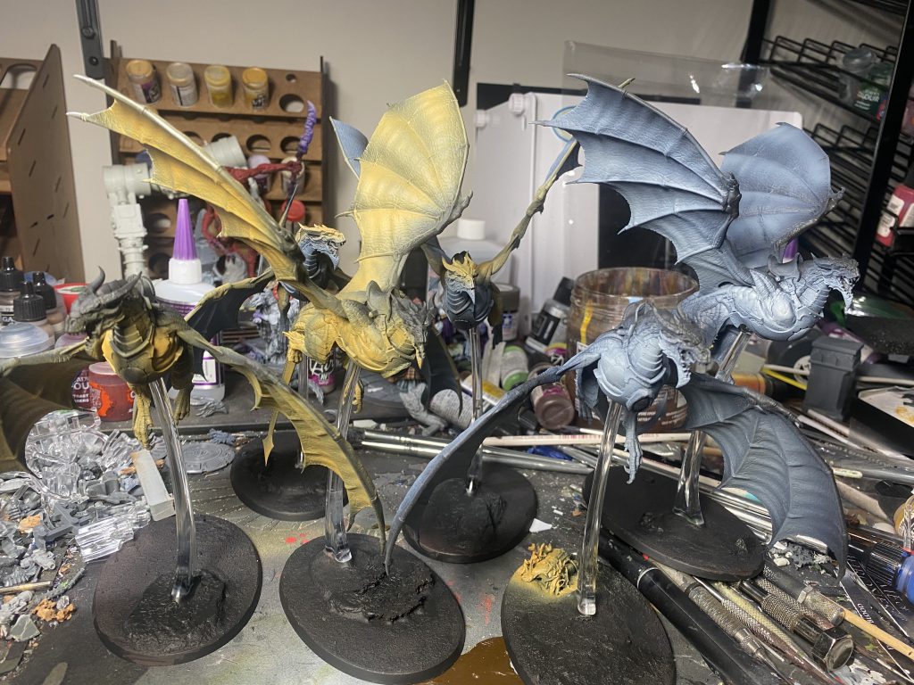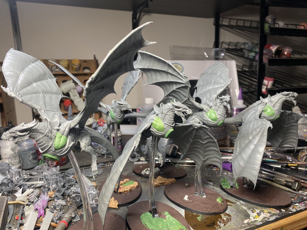 Since my previous 12 dragons only included 8 that were GW models, and with GW models potentially being required to be on Stream, plus the fact that the ones I made were very difficult to transport, I decided to acquire 6 new Stormdrake Guard from some local shops. A good friend of mine who had already built his showed me how they looked without the front legs, which makes them look more Wyvern-esque, and I fell even more in love with them. 3 boxes later, and a few days’ worth of greenstuff work, and my Storm wyverns were ready for paint.