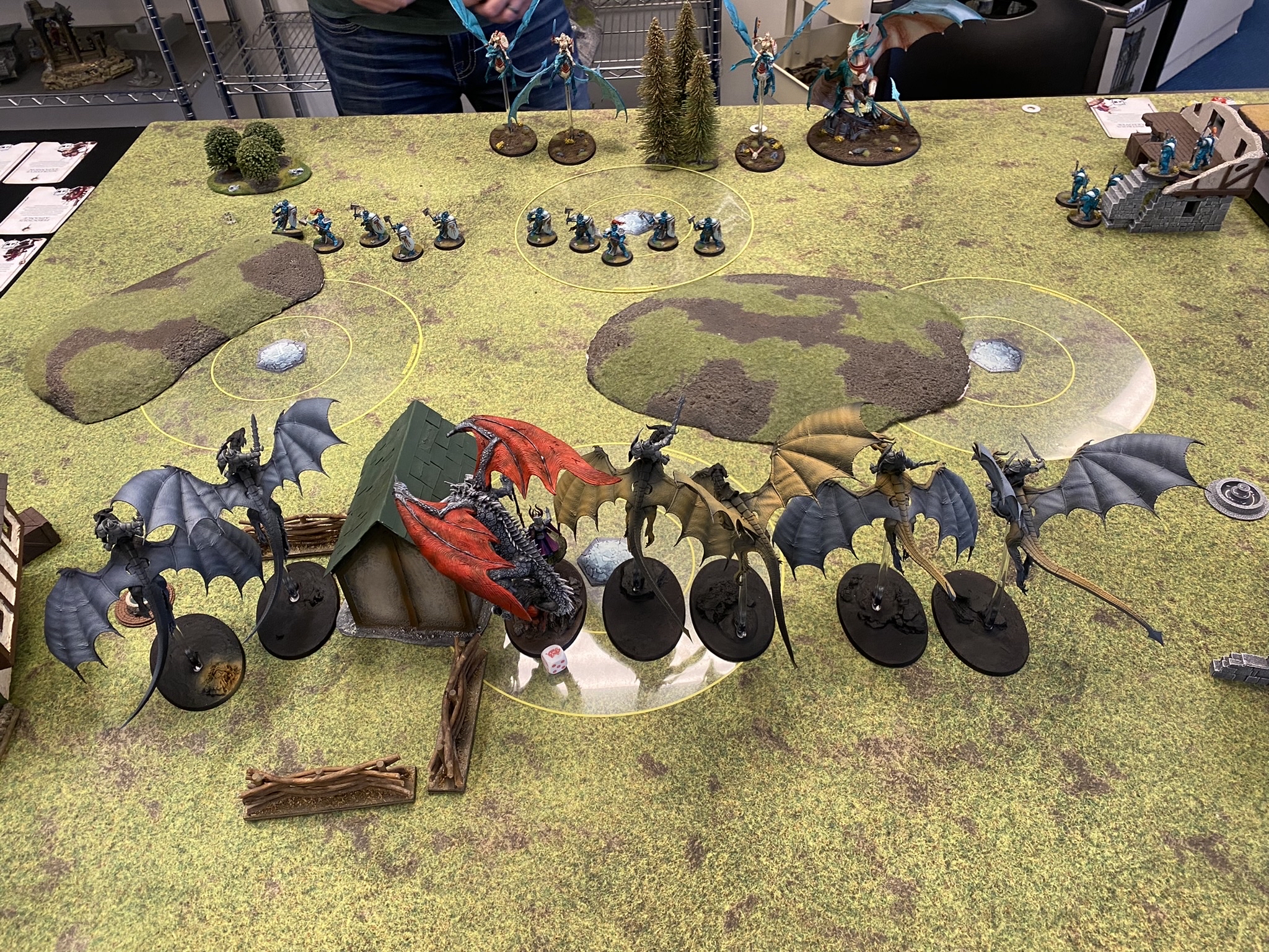 We roll for Priority for turn 2, and he takes it. He fails to cast mystic shield and forgets about the Eye of Sheerian’s -1 to hit trigger. He scores his secondary and passes. On my second turn I decide the safer battle tactic is to go with Savage Spearhead, which requires having 2+ units in John’s territory, and I score the extra again for monsters. John opts not to Finest Hour. I then Draconic onslaught all 6 dragons up to Archaon who is now almost completely on his own. I deep strike Gardus and the Fulminators, the Fulminators shoot Archaon and deal 1 wound to him. The 6 dragons shoot their dragon breath at him, the dice rolls are: 1,5,5,5,6,6… so 17 mortal wounds later archaon has taken 8 total from both Stormdrakes and Fulminators. The 6 stormdrake guard connect in combat with archaon while partially tagging the 5 lance knights and 20 warriors to his flank. After 2 units activate, Archaon, who failed to kill a single dragon in his activation, dies to the claws of the drakes. John wins priority again, charges his now buffed Karkadrak lord into combat, kills the drake Archaon couldn’t kill and then I take out the knights he previously had in combat, plus 7 warriors (4 to damage and 3 to battleshock). The game is called before my turn in round 3.