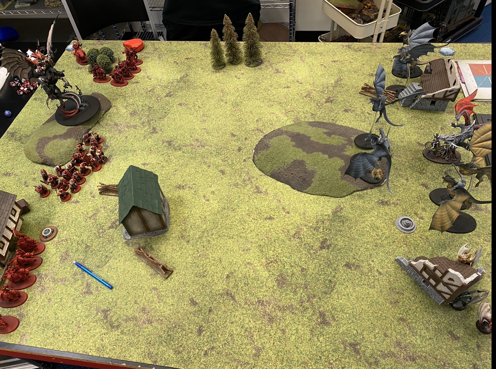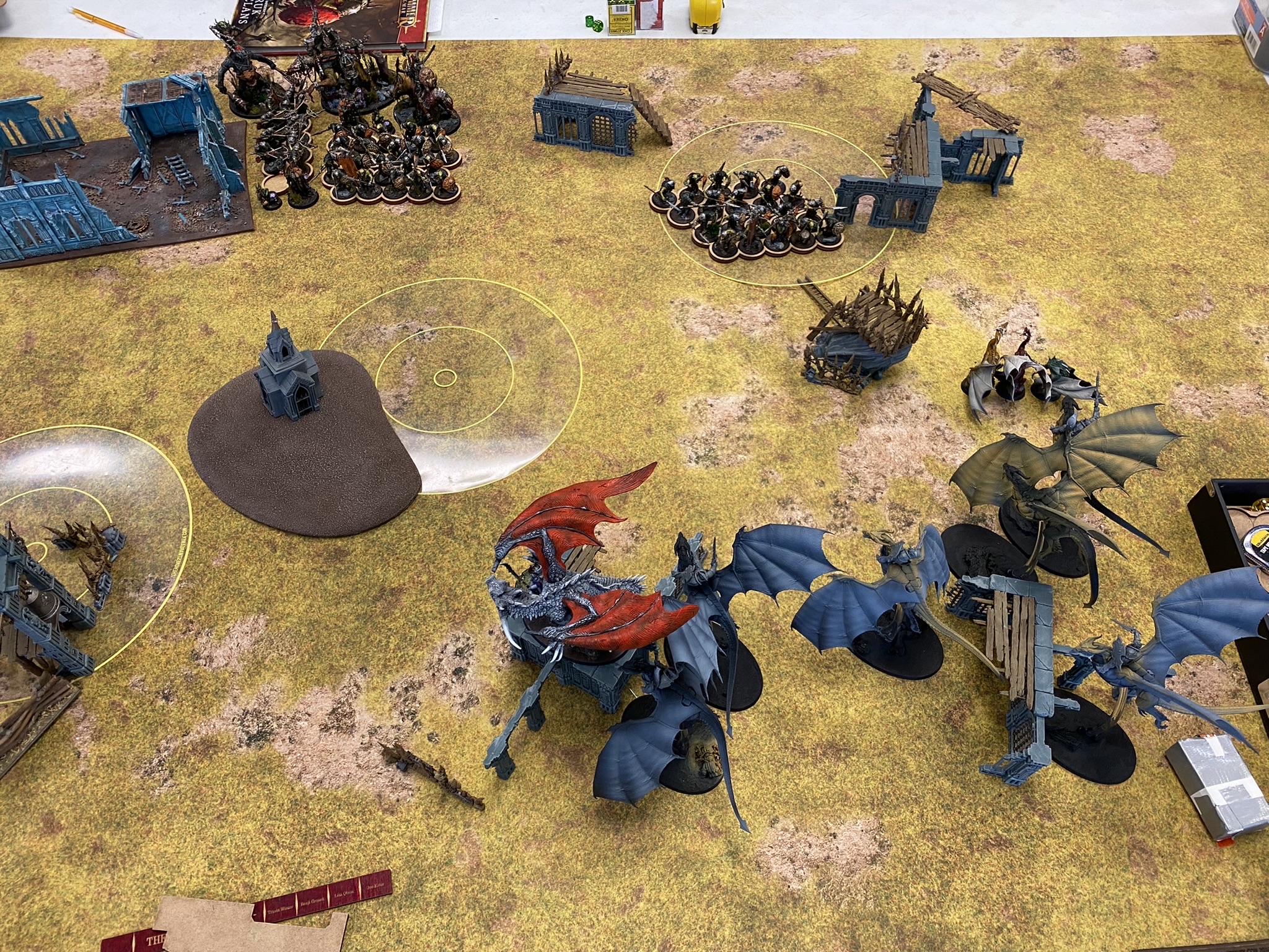 Josh has the Supa Sneaky command trait, and places 20 gutrippas on the topmost objective (from my point of view). I out deploy him by a lot and decide to take the first turn. I pick the Broken Ranks battle tactic to score 2 VP if I can destroy the battleline unit out in the middle of nowhere, and begin. My Stormdrake guard, again, triggered their once-per-game moves, the Knight draconis triggered his once-per-game Wrath of the Draconith ability to make one friendly unit within 12” shoot into the Gutrippas, and one of the squads connected on their Draconic Onslaught charge to keep that 20 block still and not able to redeploy in their Movement phase. The remaining dragons surrounded the Gutrippas. Dracothian Guard and Gardus then drop from the sky, in range to charge the other 20-model block of Gutrippas while remaining in range to shoot at the 9 Man-skewers and give the dragons the re-roll charge and ward benefits. All 7 Stormdrake Guard connect with the target Gutrippas, and the Fulminators connect with the other Gutrippas without getting in range of the Man-Skewers. After the dust settles, their targeted Gutrippas are deleted before the 4th or 5th dragon can activate, allowing him to swing with the untouched block of 20 Gutrippas at the Fulminators. I roll pretty well and after the 15 mortals he does to me, only 1 Dracothian Guard falls, and the remaining 3 Fulminators’ return punch removes 33/40 total wounds for the unit and kills 16 gutrippas. After blowing up one fulminator in combat, 34/40 gutrippas are dead. During Josh’s turn he kills 1 fulminator. I kill his Swamprat boss who charged me. Josh scores the double and uses it to clear the last 2 fulminators. And his general Mirebrute is now in combat with 2 Stormdrake Guard, which reduces him to about 3 wounds left. On my turn 2, his Skumdrek and Mirebrute boss die. We call the game before the four remaining Stormdrake guard can swing in to his pair of shamans and 8 Man-Skewers.