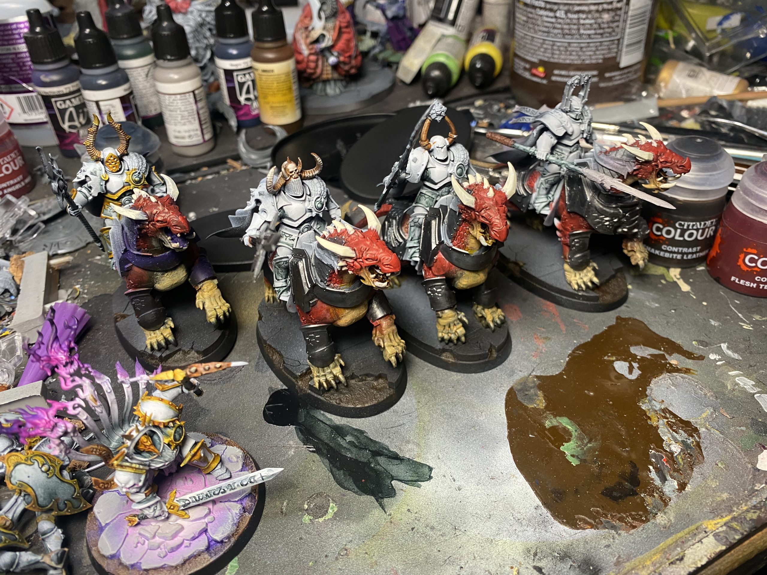 As almost all my non-Tzeentch/non Aelf armies are, I needed to do a little more work on the riders and armor plates to make them visibly corrupted by Tzeentch. Giving the rider's plate's gemstones instead of the Sigmar emblem, chaos knight weapons, and Kairic acolyte heads and shields also fit well on the riders and on the newly purchased Gardus. The Fulminators I had already converted some time earlier (possibly back in early quarantine?) to be Varanguard and so they’ve been dual-based via magnets to be either. And on top of that work, the only thing in the army I had already painted was the Knight-Draconis.