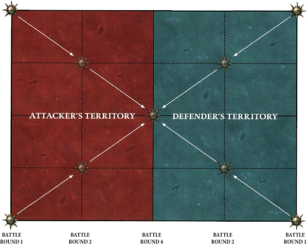 I win the roll-off for set up. I deploy far back - my plan is to prevent any turn one charges. At this distance, his only chance to reach me turn one is with the Mask of Darkness teleport spell. And then my dragons can deal with him piecemeal. I give him turn 1. He decides not to go for it and chooses the Ferocious Advance Battle Tactic, which nets him 4 points. On my turn I move up to put my stormdrake guard into cover but no further and use the same battle tactic, scoring 5 points for the turn with an extra point for the monsters.