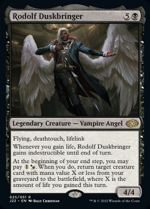 FromTheShire: He doesn't let you combo off, but Rodolf will do some powerful and annoying stuff, even if he's just in an aristocrats shell. What do you know, the first time I put Gray Merchant of Asphodel into play this turn, it DID make me gain at least 5 life! Who could have foreseen this?Loxi: Rodolf is cool, but he's a bit expensive and combines two archetypes that might be a bit hard to slap together. Being both lifegain and reanimator is unique for sure though, and oh BOY he's got good keywords as well as built in protection. I don't think he's my cup of tea, but he's gotta be good if the niche appeals to you.