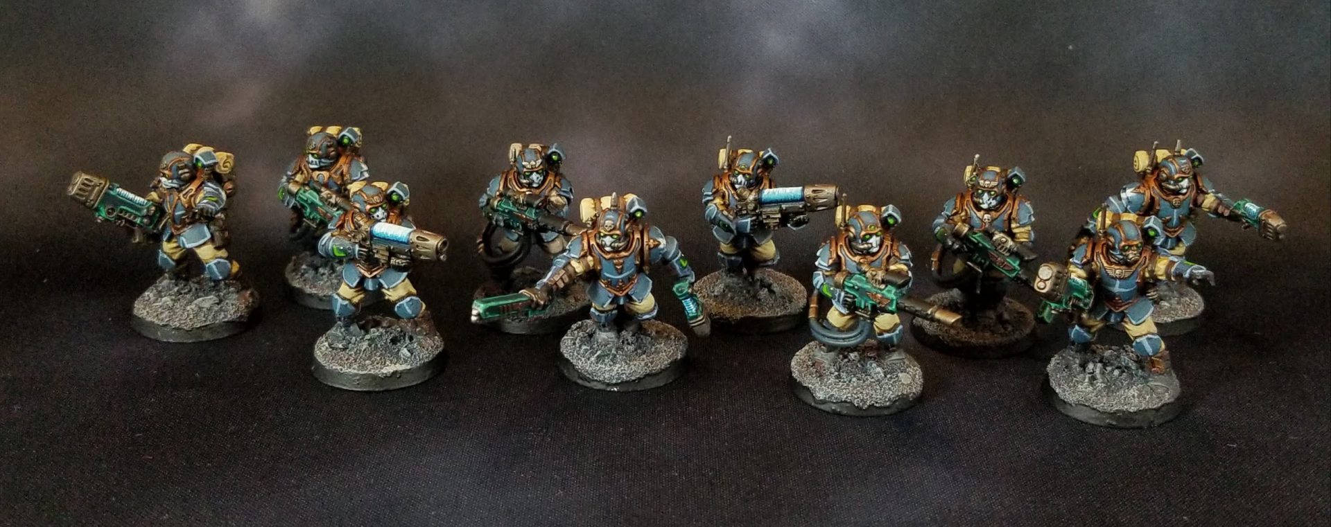 The Gunners are the real attraction here, though: each fire team can take two gunners, and each gunner gets to choose from the arc rifle, plasma caliver, and transuranic arquebus. They’ve all got their uses, and they’re all relatively nasty. The Arc Rifle can’t supercharge like the Caliver but it’s got 4 shots at AP1 with Stun and a damage profile of 4/5. And the Arquebus is Heavy and Unwieldy but it’s AP1 and will do 2 mortal wounds when you crit, plus it hits on a 2+. The plasma is, well, plasma, and is a great all-rounder weapon.